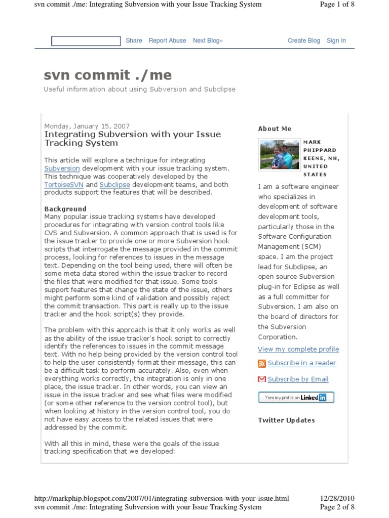 This article will explore a technique for integrating Subversion development with your issue tracking system. This technique was cooperatively developed by the TortoiseSVN and Subclipse development teams, and both products support the features that will be described. Background Many popular issue tracking systems have developed procedures for integrating with version control tools like CVS and Subversion. A common approach that is used is for the issue tracker to provide one or more Subversion hook scripts that interrogate the message provided in the commit process, looking for references to issues in the message text. Depending on the tool being used, there will often be some meta data stored within the issue tracker to record the files that were modified for that issue. Some tools support features that change the state of the issue, others might perform some kind of validation and possibly reject the commit transaction. This part is really up to the issue tracker and the hook script(s) they provide. The problem with this approach is that it only works as well as the ability of the issue tracker's hook script to correctly identify the references to issues in the commit message text. With no help being provided by the version control tool to help the user consistently format their message, this can be a difficult task to perform accurately. Also, even when everything works correctly, the integration is only in one place, the issue tracker. In other words, you can view an issue in the issue tracker and see what files were modified (or some other reference to the version control tool), but when looking at history in the version control tool, you do not have easy access to the related issues that were addressed by the commit. With all this in mind, these were the goals of the issue tracking specification that we developed: