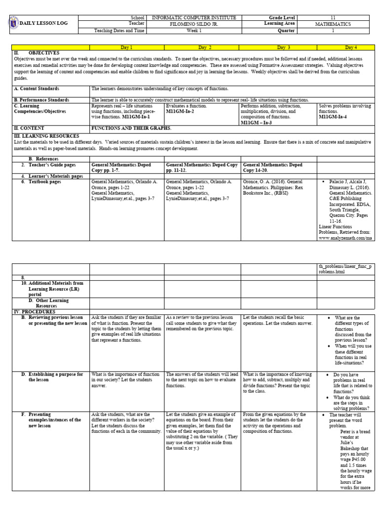 DAILY LESSON LOG Teacher FILOMENO SILDO JR. Learning Area MATHEMATICS