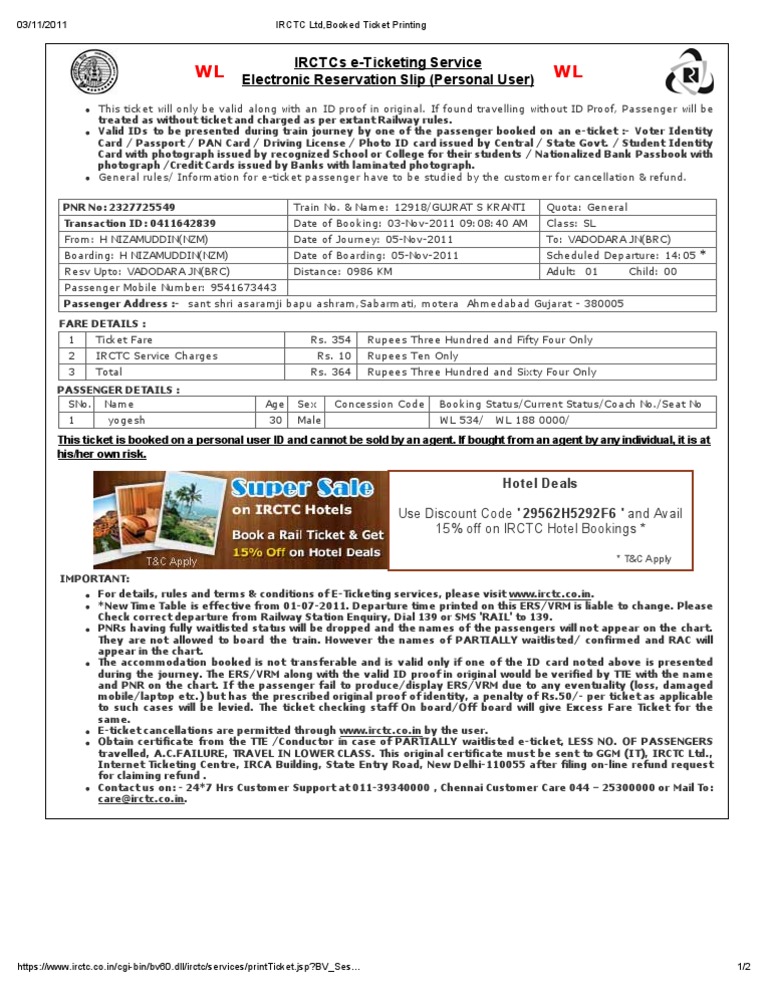 Thi ick e ill onl be alid along i h an ID p oof in o iginal. If fo nd a e lling i ho ID P oof, Pa e nge ill be treated as without ticket and charged as per extant Railway rules. Valid IDs to be presented during train journey by one of the passenger booked on an e-ticket :- Voter Identity Card / Passport / PA N Card / Driving License / Photo ID card issued by Central / State Govt. / Student Identity Card with photograph issued by recognized School or College for their students / Nationalized Bank Passbook with photograph /Credit Cards issued by Banks with laminated photograph. Ge ne al le / Info m a ion fo e - ick e pa e nge ha e o be die d b he c om e fo cance lla ion & e f nd. PNR No: 2327725549 Transaction ID: 0411642839 F om : H NIZAMUDDIN(NZM) Boa ding: H NIZAMUDDIN(NZM) Re Pa Up o: VADO DAR A JN(BR C ) e nge Mobile N m be : 9541673443 an h i a a am ji bap a h am ,Saba m a i, m o e a Ahm e dabad G ja a - 380005 T ain No. & Nam e : 12918/GUJR AT S KR ANTI Da e of Book ing: 03-No -2011 09:08:40 AM Da e of Jo Di ne : 05-No -2011 Da e of Boa ding: 05-No -2011 ance : 0986 KM Q o a: Ge ne al C la : SL e : 14:05 * To: VADO DAR A JN(BR C ) Sche d le d De pa Ad l : 01 C hild: 00