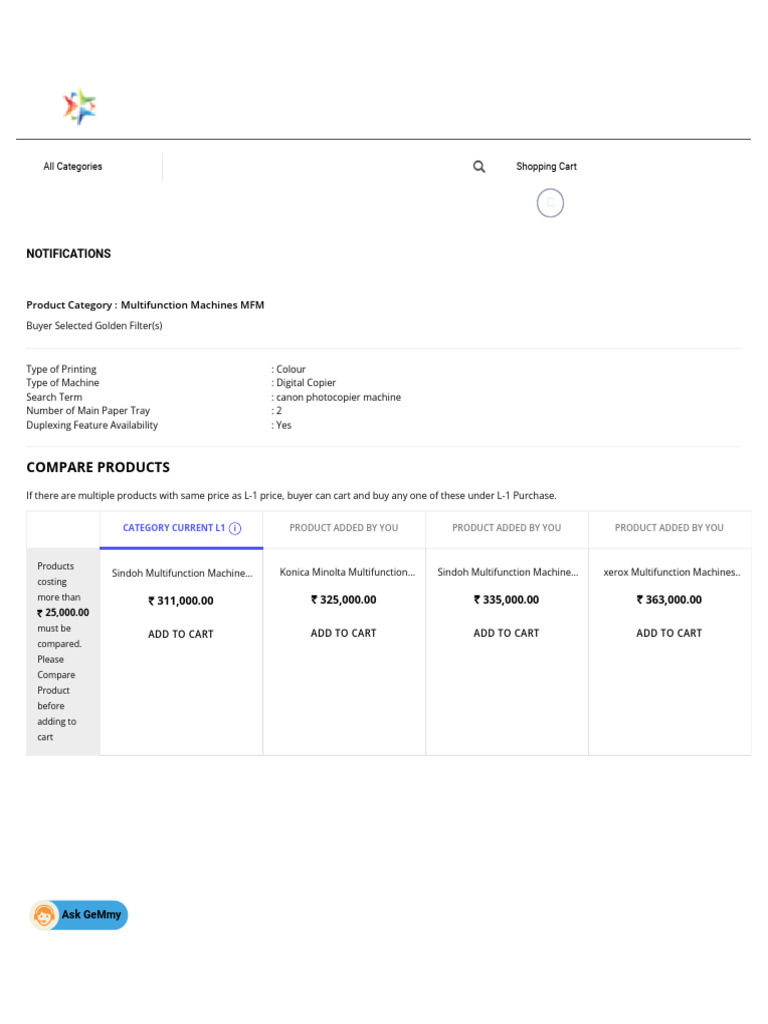 - Buyers can make direct purchases under L1 purchase mode for total order value upto Rs. 5,00,000 only (No limit in case of automobiles). Beyond this limit, buyer
