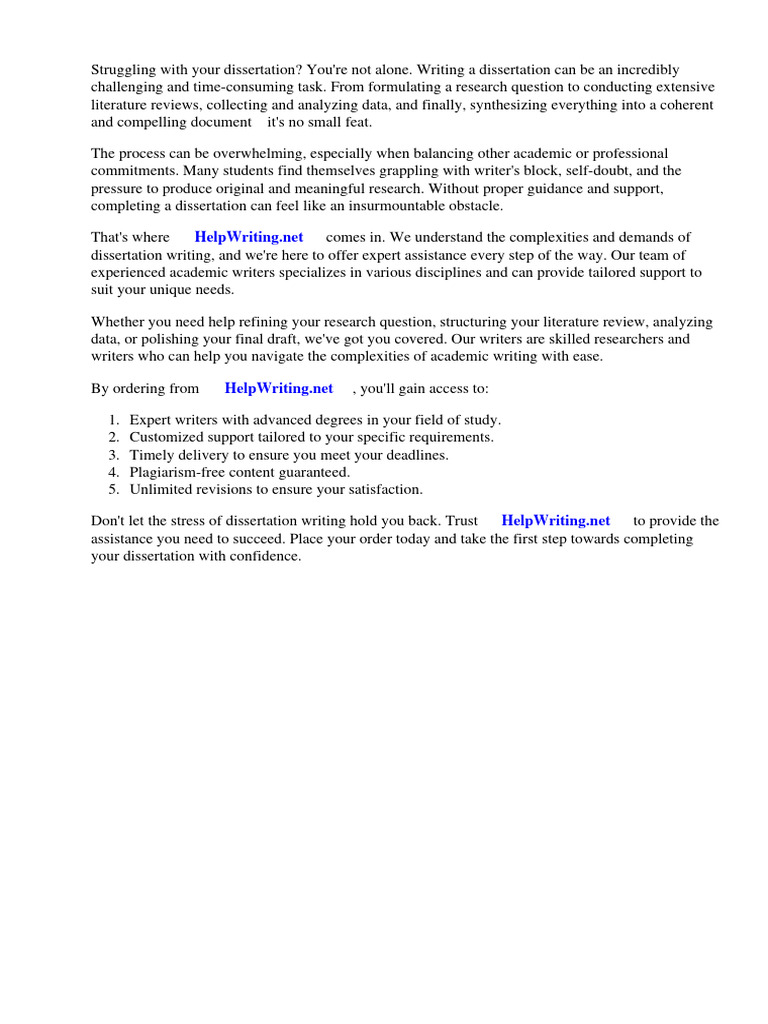 Don't let the stress of dissertation writing hold you back. Trust ⇒ HelpWriting.net ⇔ to provide the