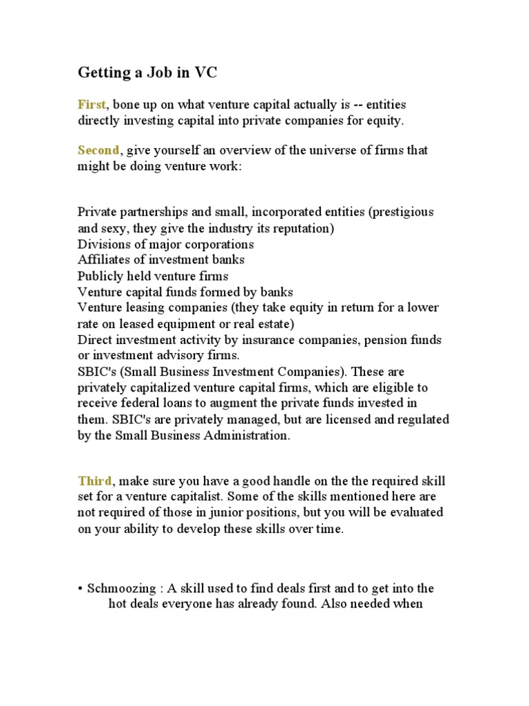 First, bone up on what venture capital actually is -- entities directly investing capital into private companies for equity. Second, give yourself an overview of the universe of firms that might be doing venture work: Private partnerships and small, incorporated entities (prestigious and sexy, they give the industry its reputation) Divisions of major corporations Affiliates of investment banks Publicly held venture firms Venture capital funds formed by banks Venture leasing companies (they take equity in return for a lower rate on leased equipment or real estate) Direct investment activity by insurance companies, pension funds or investment advisory firms. SBIC's (Small Business Investment Companies). These are privately capitalized venture capital firms, which are eligible to receive federal loans to augment the private funds invested in them. SBIC's are privately managed, but are licensed and regulated by the Small Business Administration. Third, make sure you have a good handle on the the required skill set for a venture capitalist. Some of the skills mentioned here are not required of those in junior positions, but you will be evaluated on your ability to develop these skills over time.