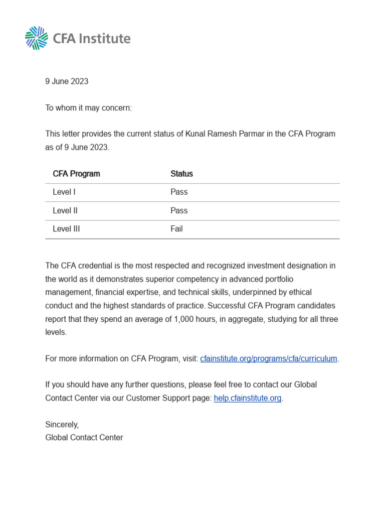 This letter provides the current status of Kunal Ramesh Parmar in the CFA Program