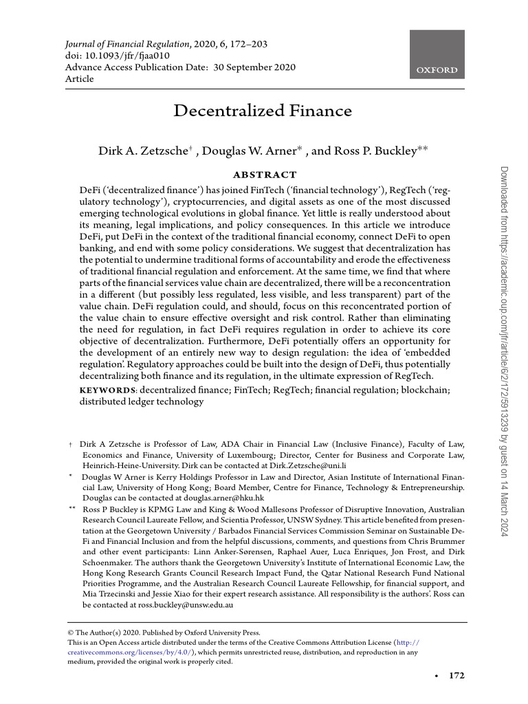 KEY WORDS: decentralized finance; FinTech; RegTech; financial regulation; blockchain;