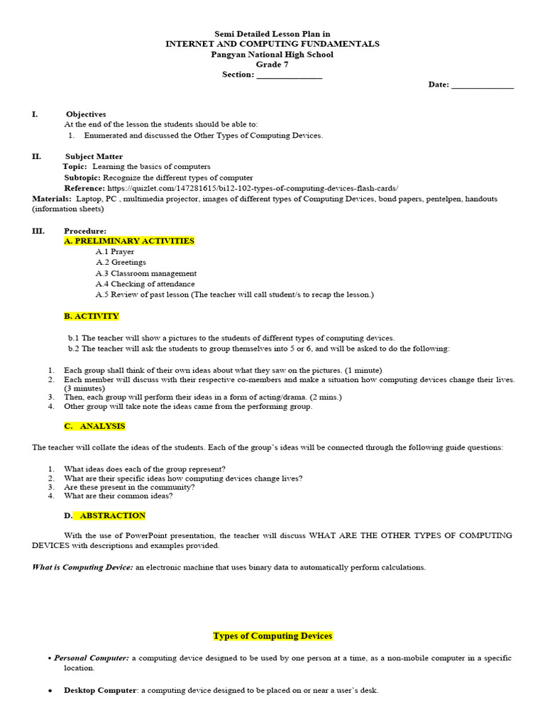 Materials: Laptop, PC , multimedia projector, images of different types of Computing Devices, bond papers, pentelpen, handouts