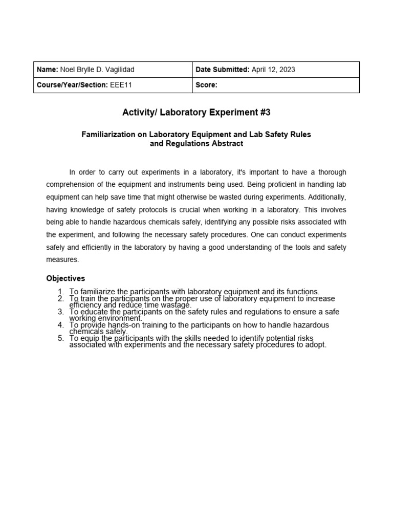 Familiarization on Laboratory Equipment and Lab Safety Rules