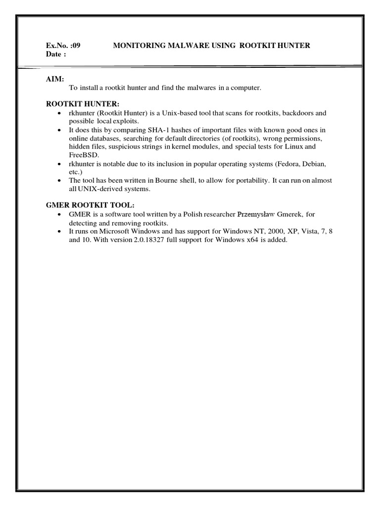 • rkhunter (Rootkit Hunter) is a Unix-based tool that scans for rootkits, backdoors and