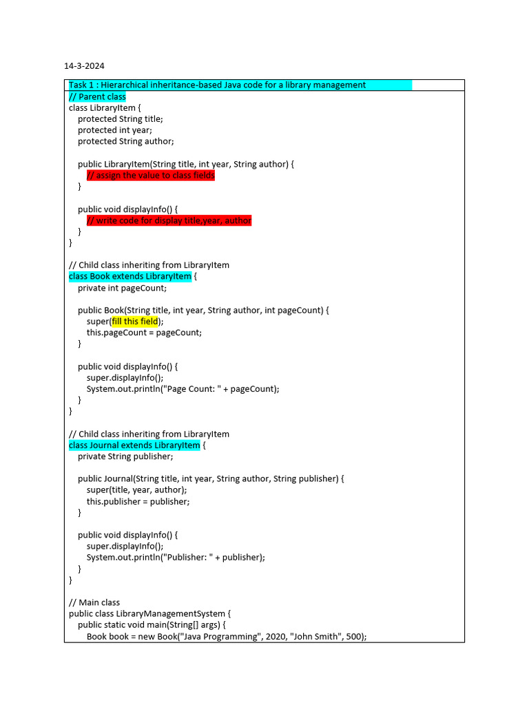 Task 1 : Hierarchical inheritance-based Java code for a library management