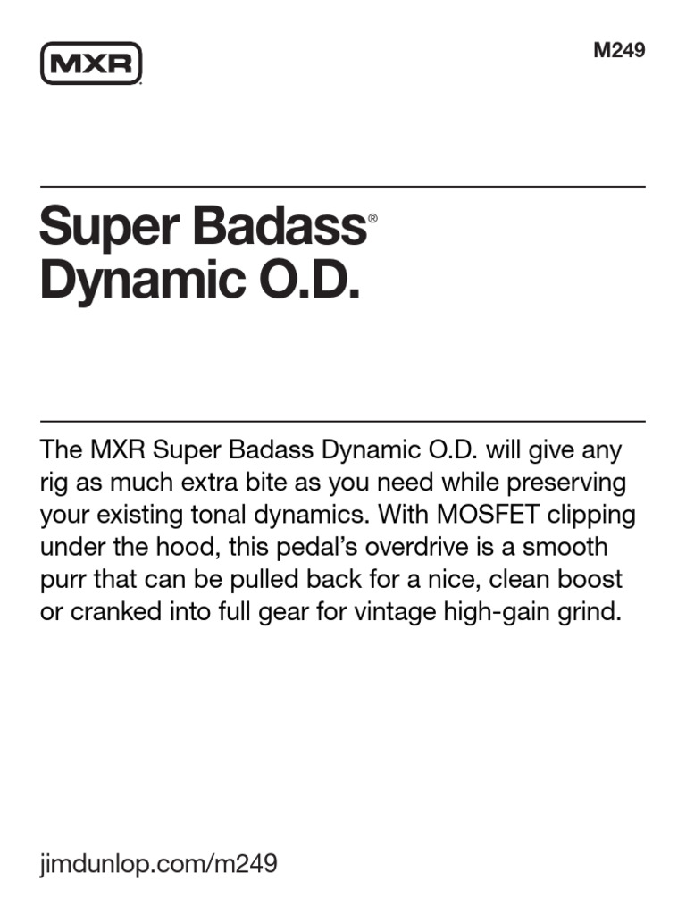 The MXR® Super Badass® Dynamic O.D. is powered 1. Run an instrument cable from your instrument to the