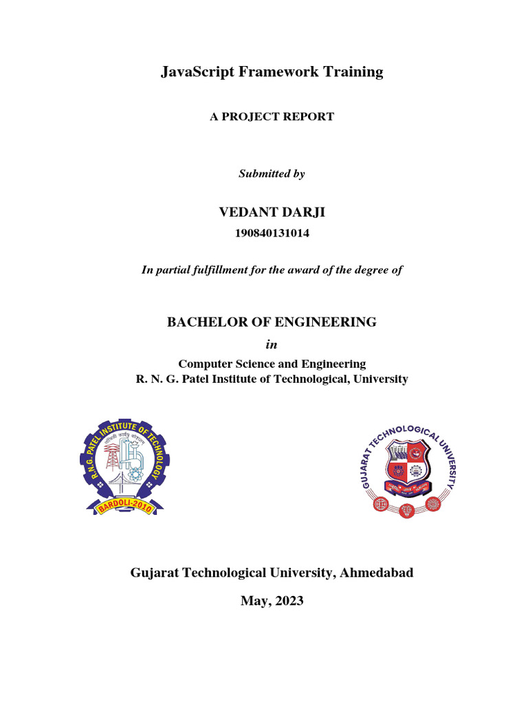 JavaScript Framework Training has been carried out by Vedant Darji under my