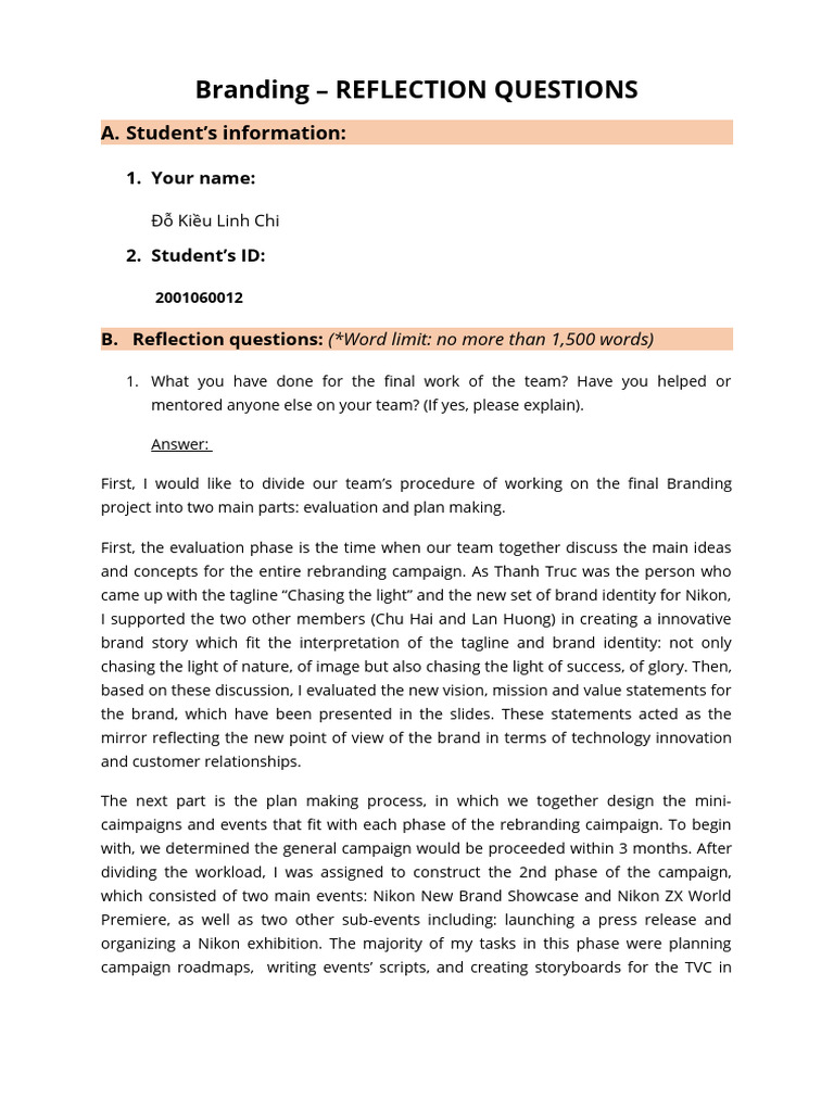 B. Reflection questions: (*Word limit: no more than 1,500 words)