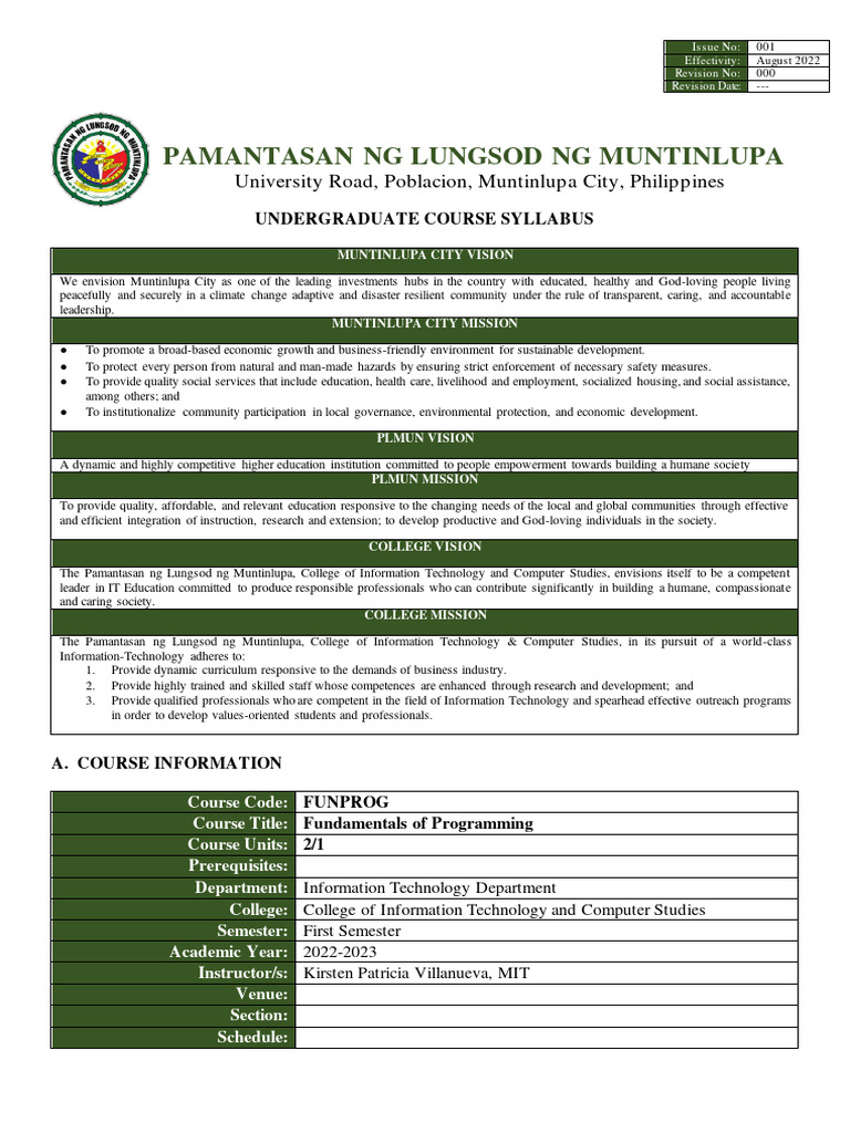 The Pamantasan ng Lungsod ng Muntinlupa, College of Information Technology & Computer Studies, in its pursuit of a world-class