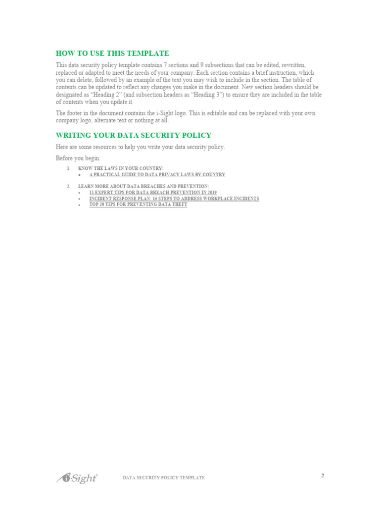 This data security policy template contains 7 sections and 9 subsections that can be edited, rewritten,