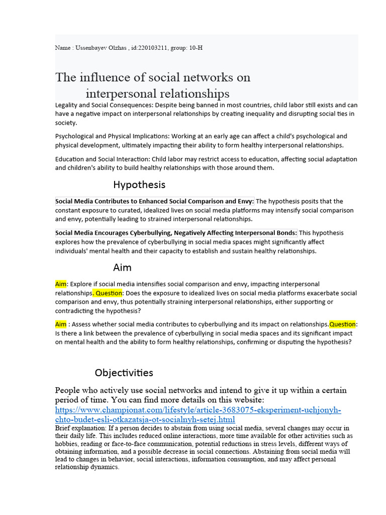 Aim : Assess whether social media contributes to cyberbullying and its impact on relationships.Question: