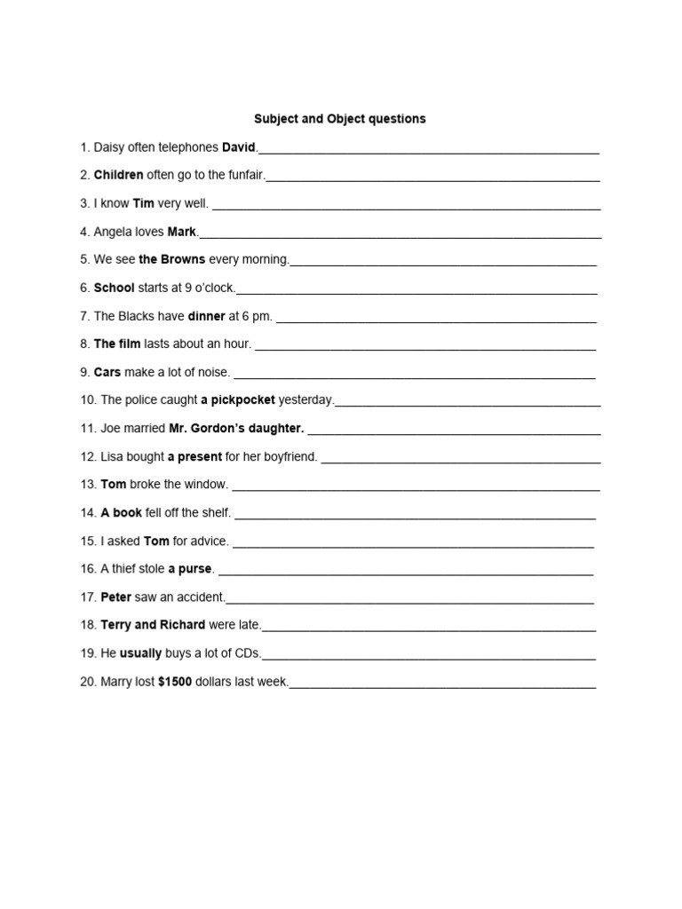 The document contains 20 sentences with blanks that require a subject or object to complete them, such as who performs an action or who/what receives an action. The sentences cover a variety of everyday topics like making phone calls, going to events, relationships, daily routines, crimes, and purchases.
