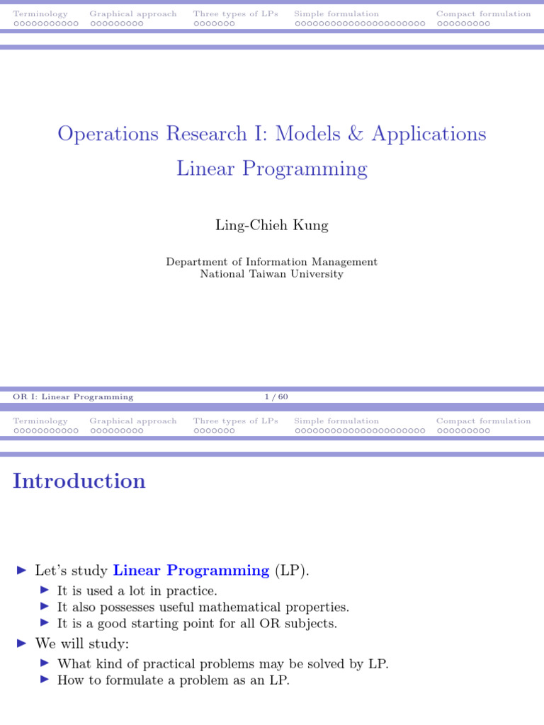 Terminology Graphical approach Three types of LPs Simple formulation Compact formulation