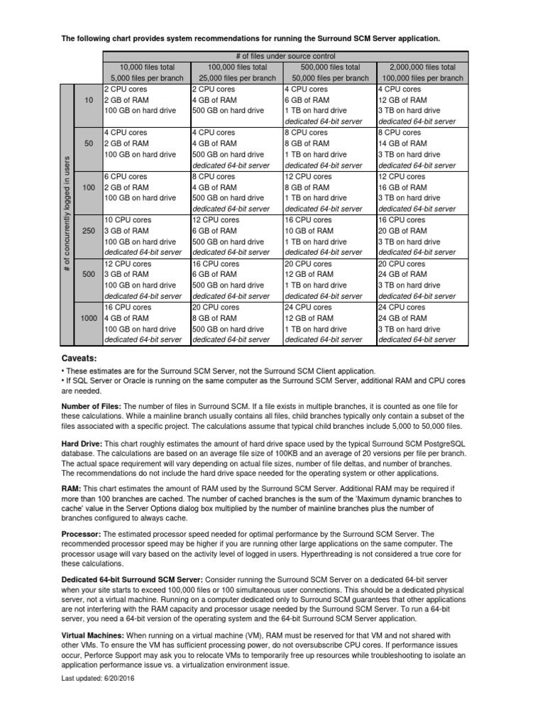 The following chart provides system recommendations for running the Surround SCM Server application.