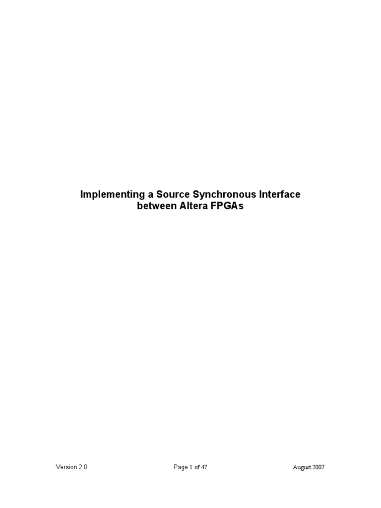 ABSTRACT Previous Tech Notes1 examined the methods of timing source synchronous inputs and outputs independently, when one device was an Altera FPGA, using the Quartus II Classic static timing analysis tool. This Tech Note examines in detail a special case when both the transmitting and receiving devices are Altera FPGAs using the new Quartus II TimeQuest static timing analysis tool. In addition to demonstrating how to do this for specific interfaces between two Altera FPGAs, information provided in the Appendices describes how to adapt this method for using on any source synchronous interface when only one side, input or output, is an Altera device. In the first example, a 550 MHz 144-bit SDR source synchronous interface is examined as a means of passing high-throughput data between two devices. In the next example, a 400 MHz 144-bit DDR source synchronous interface is examined. The method used in these examples will maximize timing margin on the data capture and demonstrate how to time the interface for both SDR and DDR connections. No practical design could run at these internal clock speeds in an FPGA today, but these examples demonstrate the speed and data width that an SDR or DDR source synchronous I/O interface is capable of running at when using Altera devices. There are several different methods used to transfer high-throughput data between devices. Table 1 shows three common methods supported in Altera FPGAs.