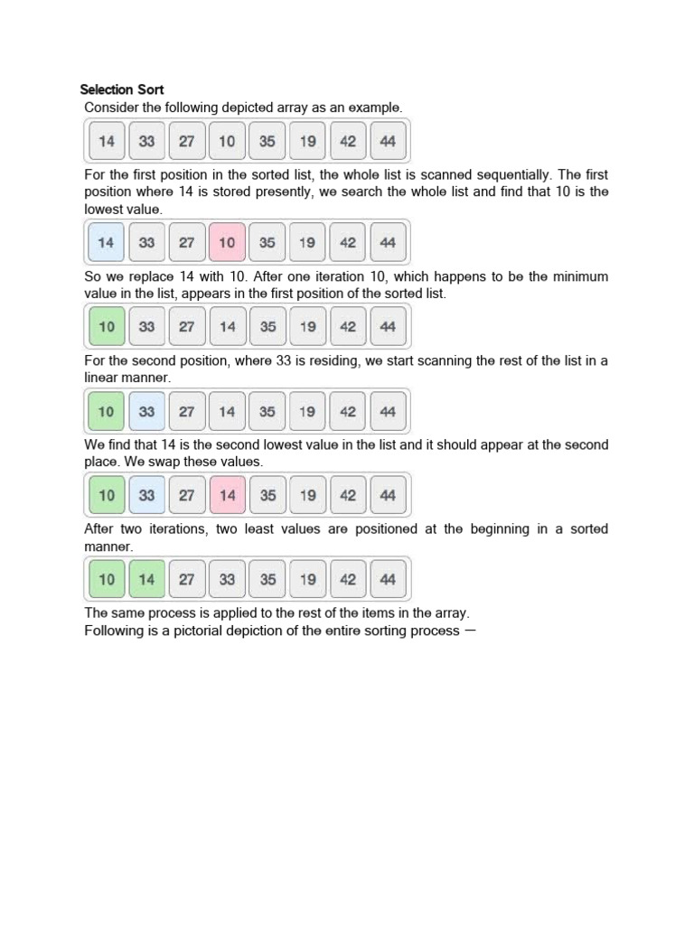 For the first position in the sorted list, the whole list is scanned sequentially. The first