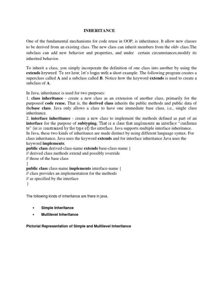 It allow new classes to be derived from an existing class. The new class can inherit members from the oldv class.The subclass can add new behavior and properties, and under certain circumstances,modify its inherited behavior. To inherit a class, you simply incorporate the definition of one class into another by using the extends keyword. To see how, lets begin with a short example. The following program creates a superclass called A and a subclass called B. Notice how the keyword extends is used to create a subclass of A. In Java, inheritance is used for two purposes: 1. class inheritance - create a new class as an extension of another class, primarily for the purposeof code reuse. That is, the derived class inherits the public methods and public data of thebase class. Java only allows a class to have one immediate base class, i.e., single class inheritance. 2. interface inheritance - create a new class to implement the methods defined as part of an interface for the purpose of subtyping. That is a class that implements an interface conforms to (or is constrained by the type of) the interface. Java supports multiple interface inheritance. In Java, these two kinds of inheritance are made distinct by using different language syntax. For class inheritance, Java uses the keyword extends and for interface inheritance Java uses the keyword implements. public class derived-class-name extends base-class-name { // derived class methods extend and possibly override // those of the base class } public class class-name implements interface-name { // class provides an implementation for the methods // as specified by the interface