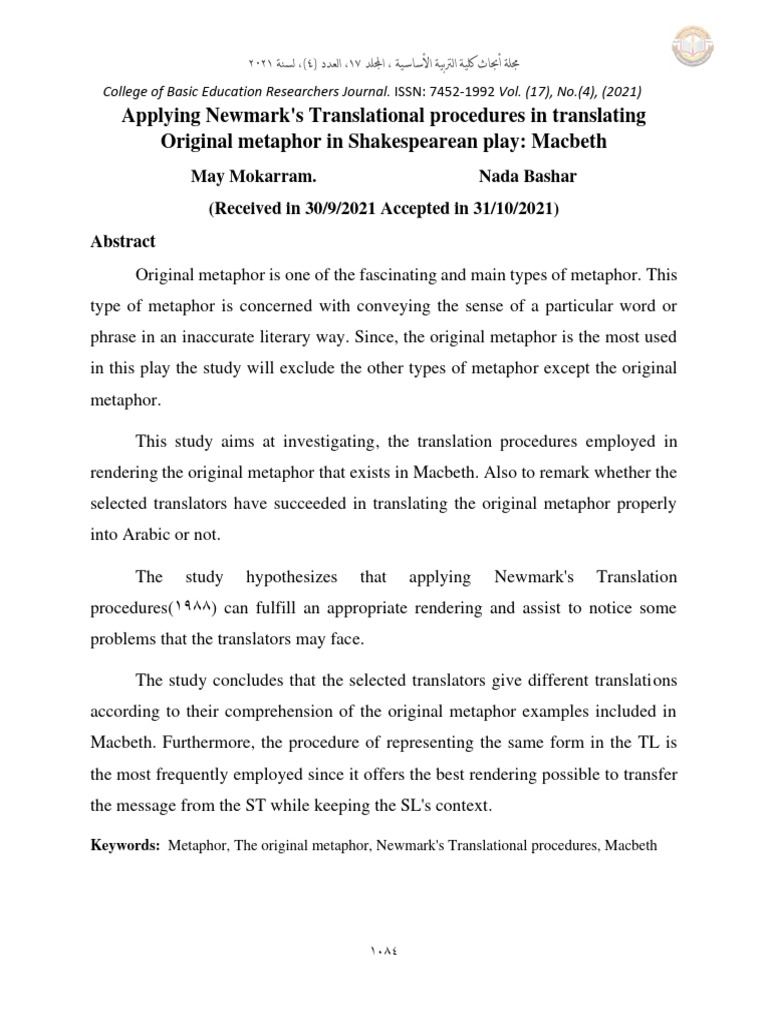 Keywords: Metaphor, The original metaphor, Newmark's Translational procedures, Macbeth