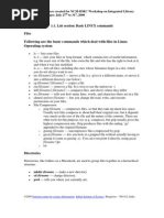 apropos bdflush cd Search the whatis database for files containing specific strings. Kernel daemon that saves dirty buffers in memory to the disk. Change the current directory. With no arguments "cd" changes to the users home directory. chmod <specification> <filename> - Effect: Change the file permissions. Effect: change the file permission to rwx for owner, re for Ex: chmod 751 myfile group Ex: chmod go=+r myfile Effect: Add read permission for the owner and the group character meanings u-user, g-group, o-other, + add permission, - remove, r-read, wwrite,x-exe Ex: chmod a +rwx myfile Effect: Allow all users to read, write or execute myfile Effect: Remove read permission from the group and Ex: chmod go -r myfile others chmod +s myfile - Setuid bit on the file which allows the program to run with user or group privileges of the file. chmod {a,u,g,o}{+,-}{r,w,x} (filenames) - The syntax of the chmod command. chown <owner1> <filename> Effect: Change ownership of a file to owner1. chgrp <group1> <filename> Effect: Change group. Perform a checksum and count bytes in a file. cp <source> <destination> Copy a file from one location to another. Convert and copy a file formatting according to the options. Disk or data duplication. List directory contents. Set colors up for ls. Determines file type. Also can tell type of library (a.out or ELF). Ex: find $Home name readme Print search for readme starting at home and output full path. How to find files quickly using the find command: Ex: find ~ -name report3 print "~" = Search starting at the home directory and proceed through all its subdirectories "-name report3" = Search for a file named report3 "-print" = Output the full path to that file Copy multiple files and set attributes. Make links between files. File locating program that uses the slocate database.