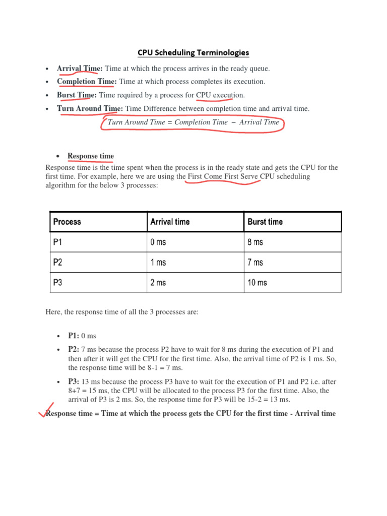 Response time = Time at which the process gets the CPU for the first time - Arrival time