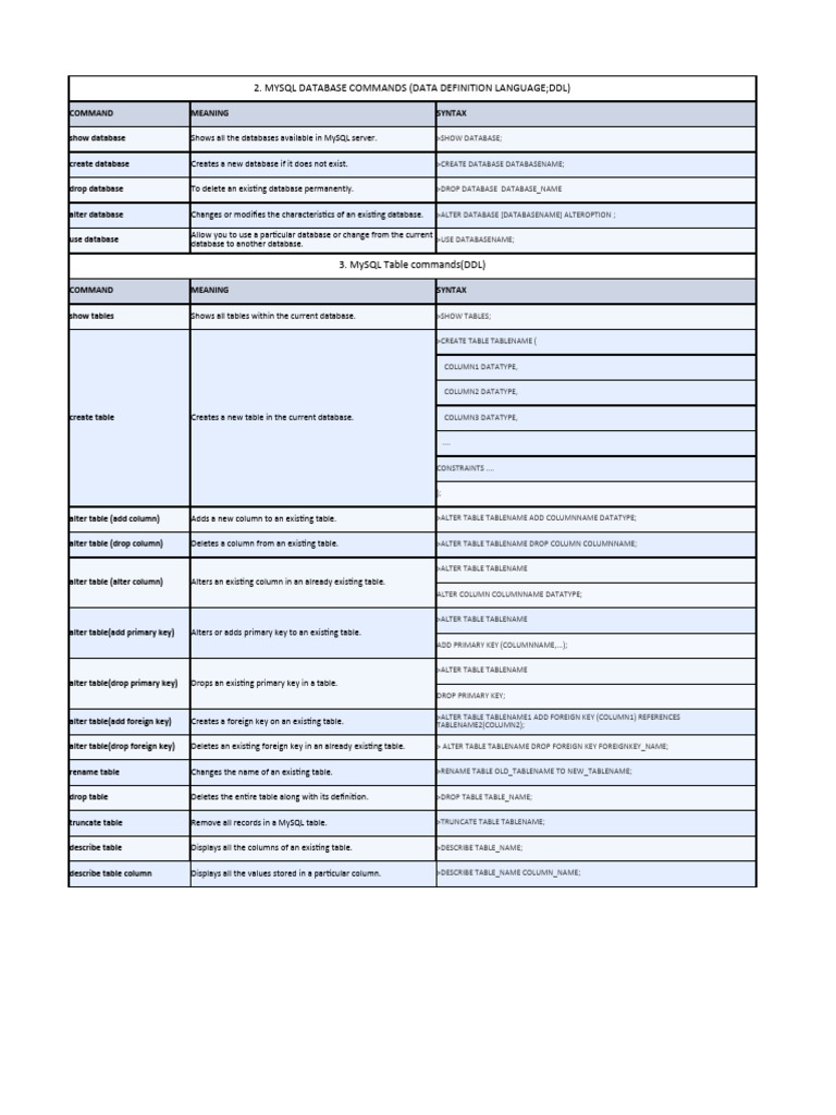 MYSQL DATABASE COMMANDS (DATA DEFINITION LANGUAGE;DDL)