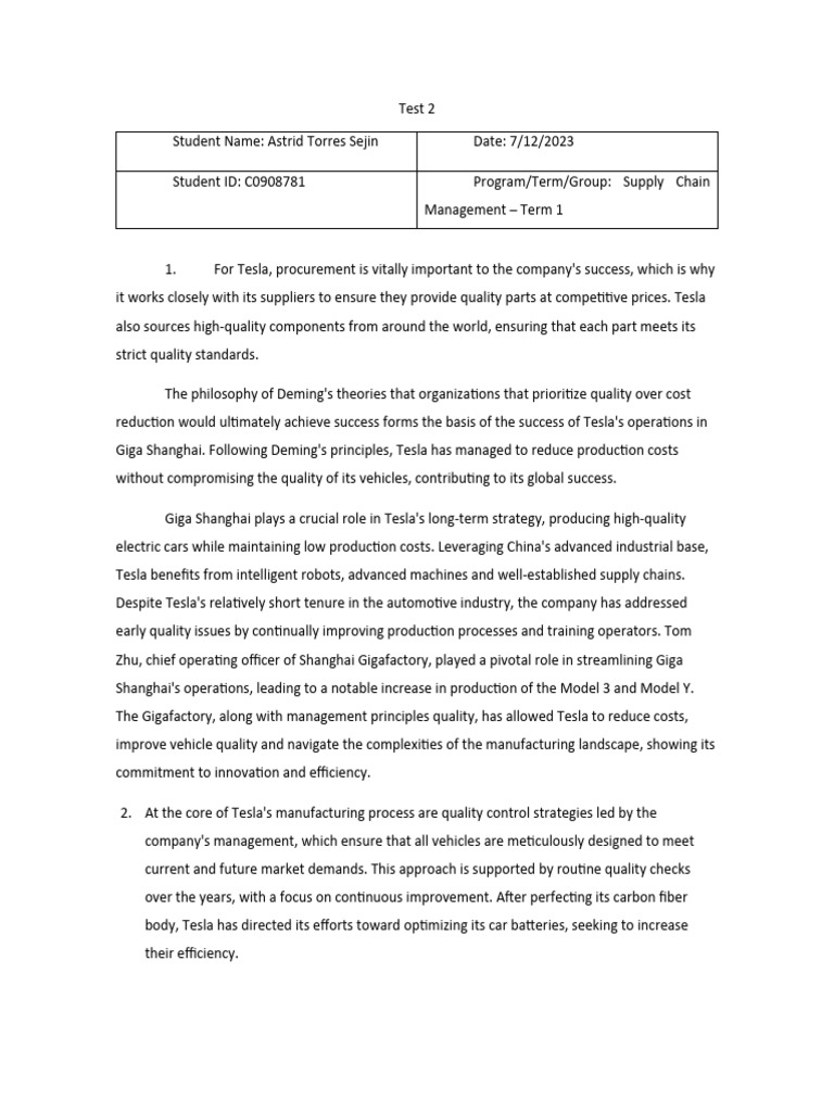 Caballero, N. (n.d.). The crucial role of quality management in tesla’s Giga Shanghai factory.