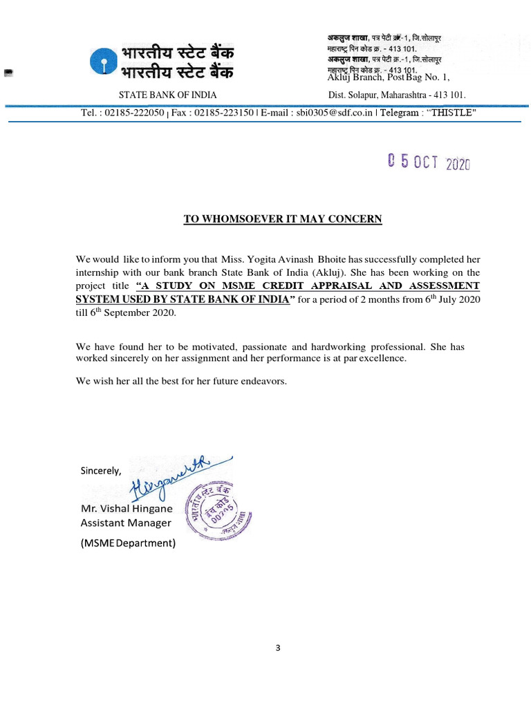 internship with our bank branch State Bank of India (Akluj). She has been working on the