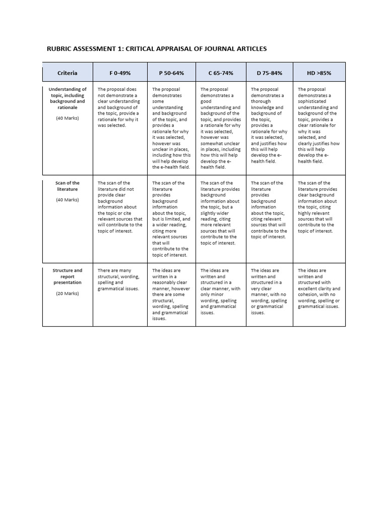 RUBRIC ASSESSMENT 1: CRITICAL APPRAISAL OF JOURNAL ARTICLES