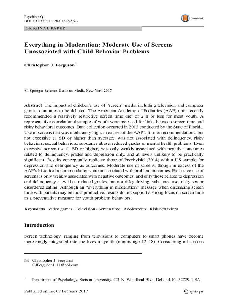 depression and delinquency as outcomes. Moderate use of screens, though in excess of the