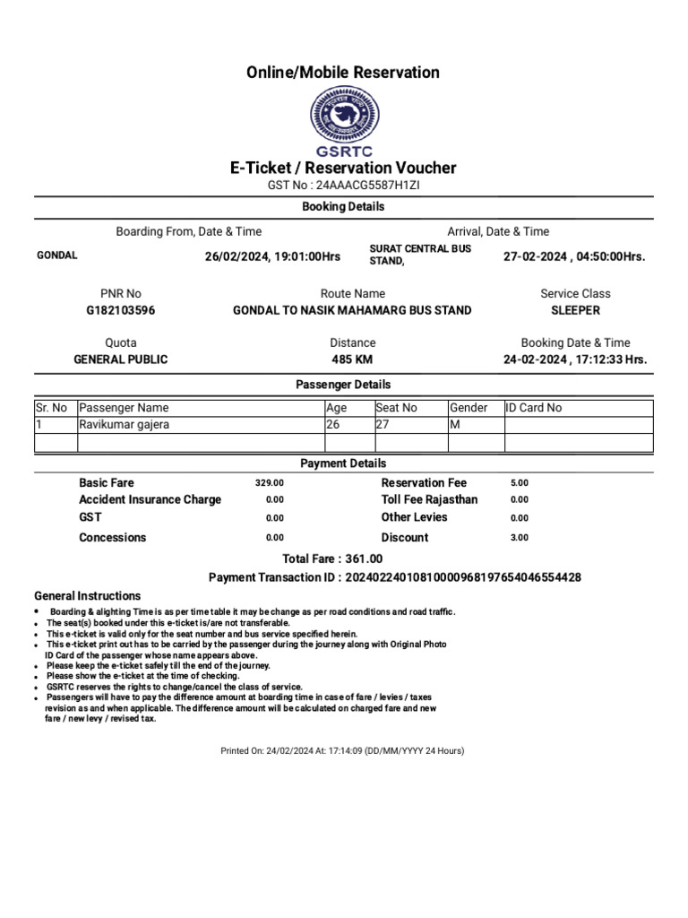 G182103596 GONDAL TO NASIK MAHAMARG BUS STAND SLEEPER