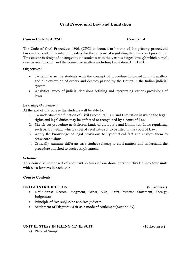 UNIT II: STEPS IN FILING CIVIL SUIT (10 Lectures)