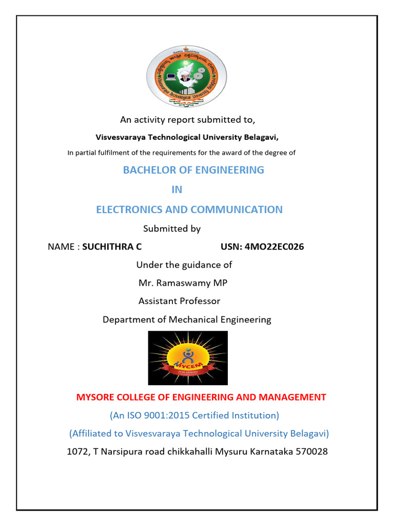 Certified that the activity is carried out by SUCHITHRA C, bearing USN