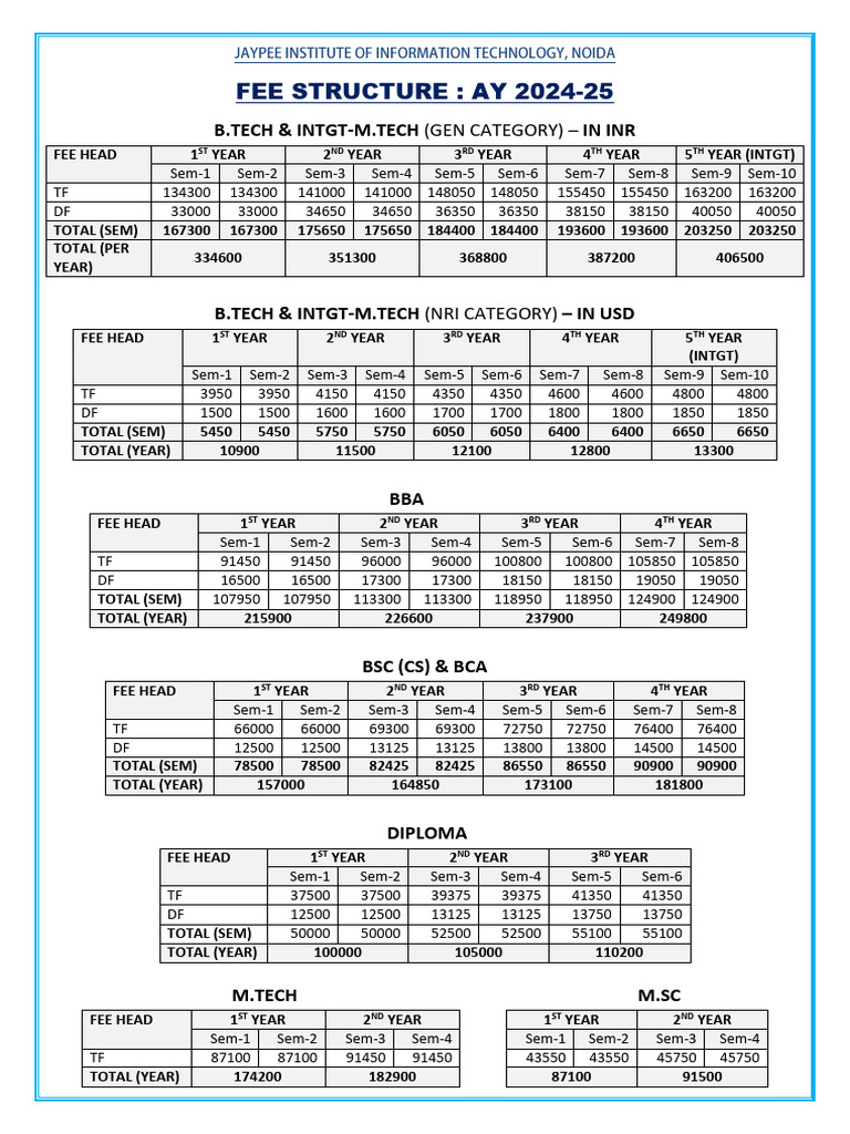 1. Hostel Charges: Rs. 1.00 Lakh per Semester (Gen), USD 1500 (NRI/Foreign)