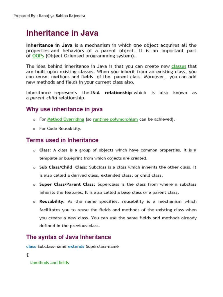 o Super Class/Parent Class: Superclass is the class from where a subclass