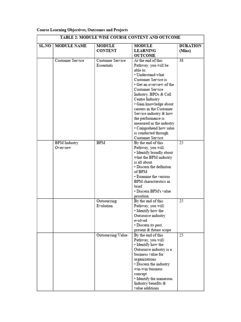 TABLE 2: MODULE WISE COURSE CONTENT AND OUTCOME