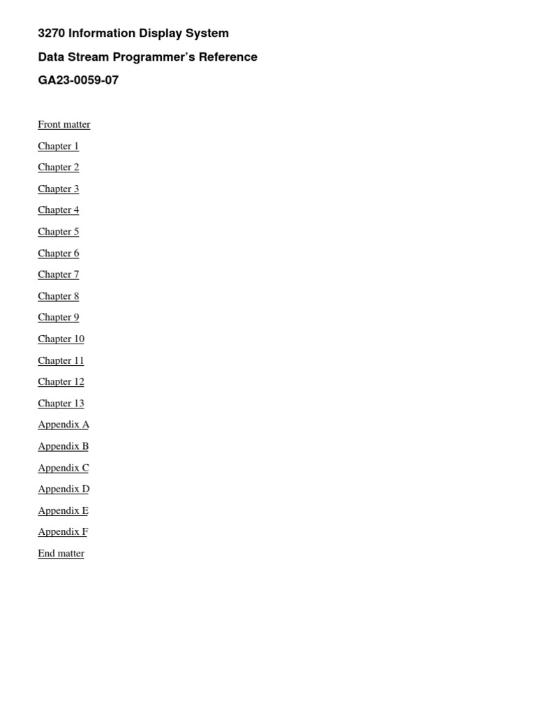Activate Partition Managing the Presentation Space Partition Wait Condition (PWAIT) System Lock Condition Terminal Wait (TWAIT) Condition Chapter 3. 3270 Data Stream Commands Introduction Commands within Structured Fields Command Codes Write Control Character (WCC) Byte Write Operation Read Operations Read Operations from Partitions Read Operations for SNA Inbound Operation (INOP) Inbound Partition Identifier (INPID) Enter Actions Processing of Read Commands (Alphanumeric) Chapter 4. Character Sets, Orders, and Attributes Introduction Character Sets Orders Attributes Processing of Character Attributes Defaults for Attributes Chapter 5. Outbound/Inbound and Outbound Structured Fields Introduction Structured Field Grouping Structured Field Self-Defining Parameters Outbound Structured Fields Activate Partition Begin/End of File Create Partition Destroy Partition Erase/Reset Load Color Table Load Format Storage Load Line Type Load Programmed Symbols (Load PS) Modify Partition Outbound Text Header Outbound 3270DS Present Absolute Format Present Relative Format Read Partition Request Recovery Data Reset Partition Restart SCS Data Select Color Table Select Format Group Set Checkpoint Interval Set MSR Control Set Partition Characteristics Set Printer Characteristics Set Reply Mode Set Window Origin Type 1 Text Outbound Outbound/Inbound Structured Fields Data Chain Destination/Origin Object Control