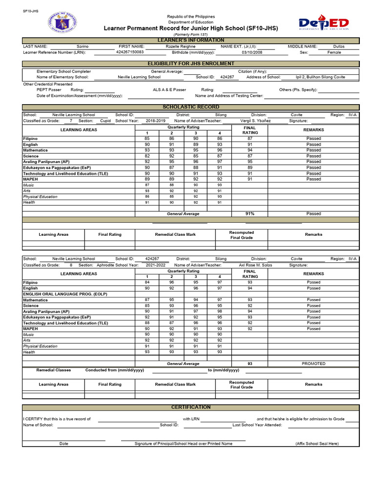 Learner Permanent Record for Junior High School (SF10-JHS)