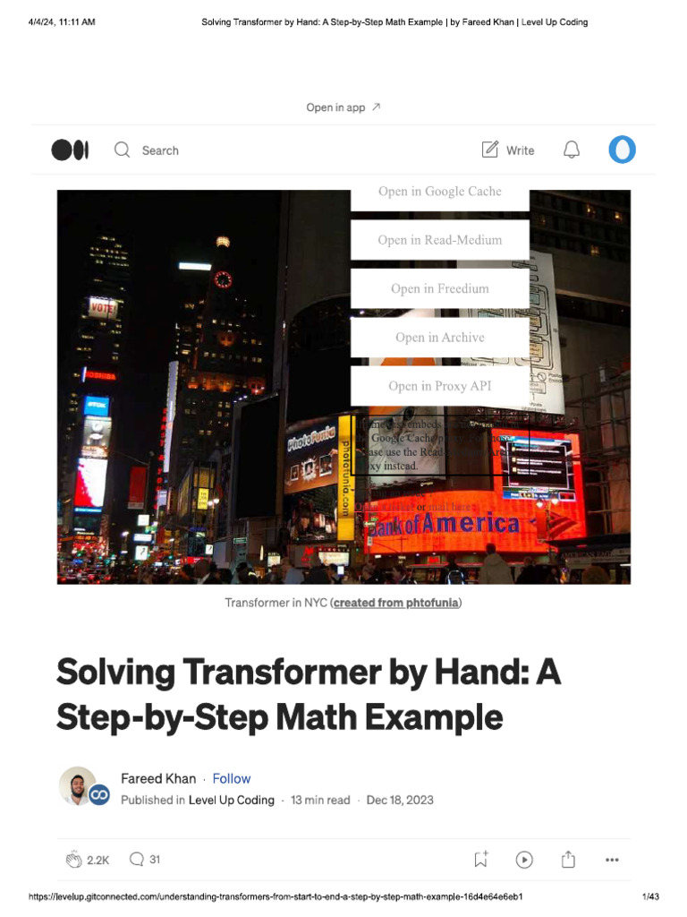 hntps:evelupgitcornectee,comlunerstanding-transtormers-rom-star-to-end-a-step-by-step-math-example-t6ddesdebebtstar24, 111 AM Solving Transformer by Hand: A Step-by-Step Math Example | by Farced Knan | Level Up Coding