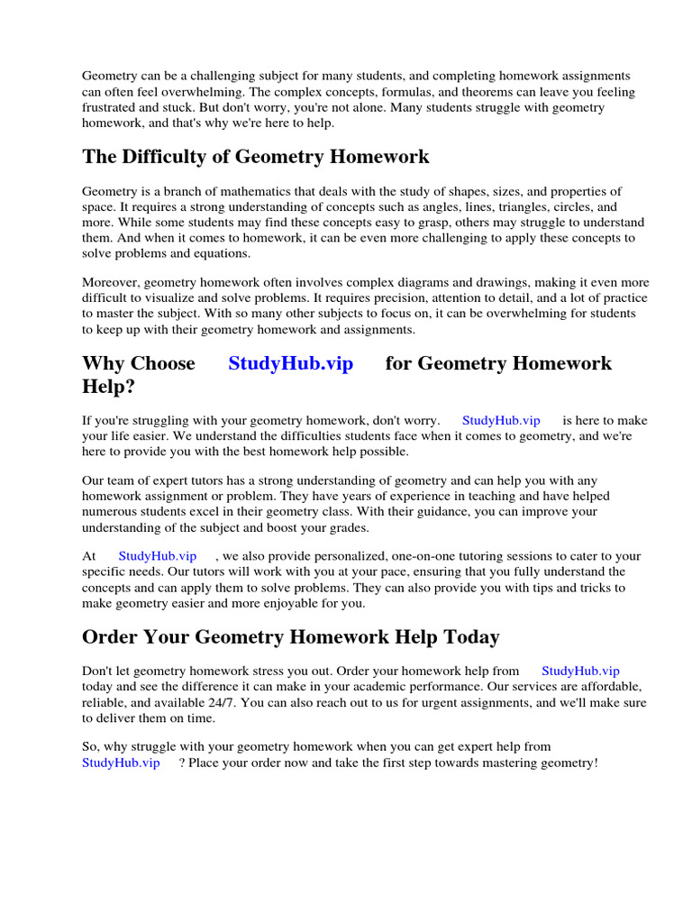 Don't let geometry homework stress you out. Order your homework help from ⇒ StudyHub.vip ⇔