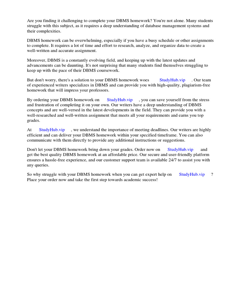 But don't worry, there's a solution to your DBMS homework woes – ⇒ StudyHub.vip ⇔. Our team