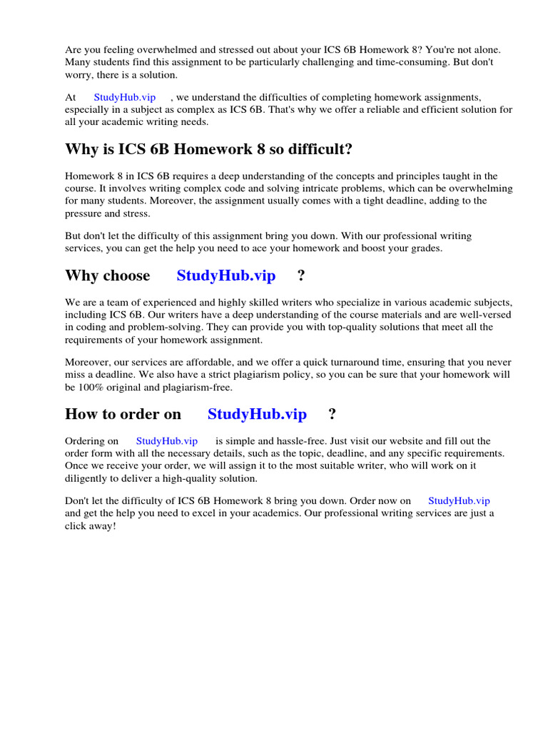 Don't let the difficulty of ICS 6B Homework 8 bring you down. Order now on ⇒ StudyHub.vip ⇔