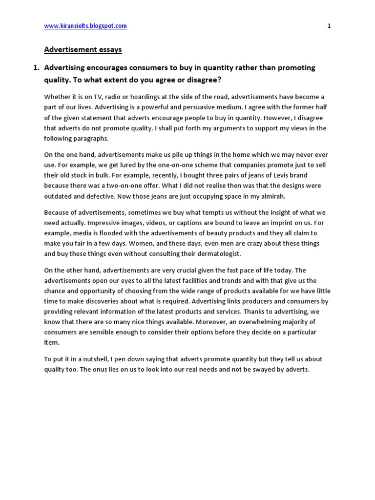 Advertisement essays 1. Advertising encourages consumers to buy in quantity rather than promoting quality. To what extent do you agree or disagree?