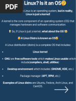 When a file system starts, first the file /boot is read and then /Linux is read /bin directory contains the executables of Linux commands written in c or shell scripts /etc directory contains other additional commands that are related to the system maintenance and administration. it contains several files with information abou t users, terminals and devices /lib library functions that can be used by the programmers /dev stores files related to devices /usr a directory is created for each user to have a private work area. It is cal led users home directory Standard input and output is keyboard, terminal screen they are numbered as 0 an d 1. standard error is terminal screen numbered as 3 output and input can be given to any other device using redirection $date >today it creates a file called today with the output of the date command $cat <names it will direct the contents of the file names to cat command. $ cat<name>list this copies the content of the files names to a new file list $ ls ch* all files starting ch $ls ch?.? ? represents one character while * many $ ls ex[1-3] will list range of files ex1,ex2, ex3 //variables $ echo ${HOME} gives you your home directory Other environment variables are PS1 (where $ prompt is stored, by changing the p rompt will change) ,PATH, TERM (the terminal type),HOMR, LOGNAME,MAIL(path name of messages),PS2 (the Bourne shell prompt defalut >) . profile file contains login name, home directory name etc and will be executed if it resides in the home directory. //more file commands