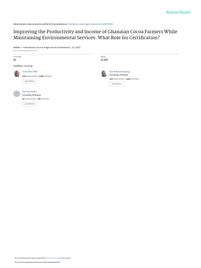 Fredua Agyeman (2013): Improving the productivity and income of Ghanaian cocoa farmers while maintaining