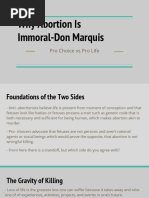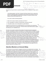person is not agreed upon. Pro-abortion supporters must therefore defend their assumption by defining personhood with characteristics that a fetus does not have. For example, the pro-abortion definition of personhood includes characteristics such as consciousness, reasoning, the ability to communicate, and self-awareness. A fetus has none of these at conception, and in later stages of development may be capable of only one (consciousness), so such a definition of personhood supports the statement that a fetus is not a person. It follows that such a definition supports the idea that abortion is not immoral; however, it does not successfully prove that idea because it is inherently flawed. Many people who dont satisfy the definition are still considered persons and have the rights pro-abortion groups are attempting to deny the fetus. Comatose patients, as well as most infants, are among those who wouldnt be considered persons if this definition were valid. And because such people are, in fact, persons, the definition of personhood suggested by supporters of abortion does not prove that abortion is morally acceptable. Many anti-abortion groups have formed their argument in basically the same way. In their attempt to prove that abortion is not morally acceptable, anti-abortion groups argue that a fetus is a person and thus has the same right to life to which other persons are entitled. In contrast with the pro-abortion argument, this argument is sound so long as the definition of personhood includes only characteristics that a fetus has. In order to accomplish this, the primary antiabortion definition of personhood is the capacity, or potential, to develop characteristics like consciousness, self-awareness, and reasoning, not the characteristics themselves. Just as the pro-abortion definition supported the claim