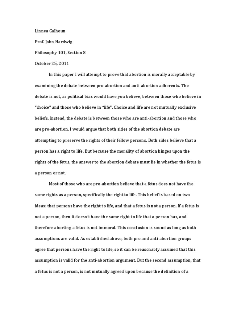 John Hardwig Philosophy 101, Section 8 October 25, 2011 In this paper I will attempt to prove that abortion is morally acceptable by examining the debate between pro-abortion and anti-abortion adherents. The debate is not, as political bias would have you believe, between those who believe in choice and those who believe in life. Choice and life are not mutually exclusive beliefs. Instead, the debate is between those who are anti-abortion and those who are pro-abortion. I would argue that both sides of the abortion debate are attempting to preserve the rights of their fellow persons. Both sides believe that a person has a right to life. But because the morality of abortion hinges upon the rights of the fetus, the answer to the abortion debate must lie in whether the fetus is a person or not. Most of those who are pro-abortion believe that a fetus does not have the same rights as a person, specifically the right to life. This belief is based on two ideas: that persons have the right to life, and that a fetus is not a person. If a fetus is not a person, then it doesnt have the same right to life that a person has, and therefore aborting a fetus is not immoral. This conclusion is sound as long as both assumptions are valid. As established above, both pro and anti-abortion groups agree that persons have the right to life, so it can be reasonably assumed that this assumption is valid for the anti-abortion argument. But the second assumption, that a fetus is not a person, is not mutually agreed upon because the definition of a