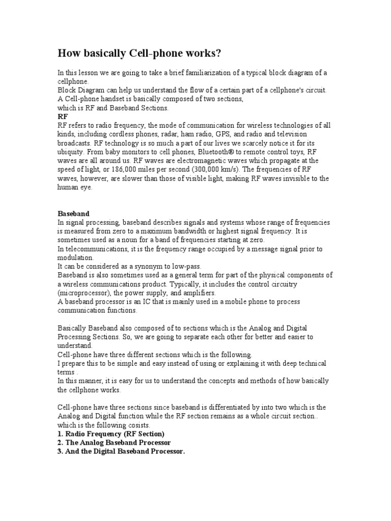 In this lesson we are going to take a brief familiarization of a typical block diagram of a cellphone. Block Diagram can help us understand the flow of a certain part of a cellphone's circuit. A Cell-phone handset is basically composed of two sections, which is RF and Baseband Sections. RF RF refers to radio frequency, the mode of communication for wireless technologies of all kinds, including cordless phones, radar, ham radio, GPS, and radio and television broadcasts. RF technology is so much a part of our lives we scarcely notice it for its ubiquity. From baby monitors to cell phones, Bluetooth to remote control toys, RF waves are all around us. RF waves are electromagnetic waves which propagate at the speed of light, or 186,000 miles per second (300,000 km/s). The frequencies of RF waves, however, are slower than those of visible light, making RF waves invisible to the human eye. Baseband In signal processing, baseband describes signals and systems whose range of frequencies is measured from zero to a maximum bandwidth or highest signal frequency. It is sometimes used as a noun for a band of frequencies starting at zero. In telecommunications, it is the frequency range occupied by a message signal prior to modulation. It can be considered as a synonym to low-pass. Baseband is also sometimes used as a general term for part of the physical components of a wireless communications product. Typically, it includes the control circuitry (microprocessor), the power supply, and amplifiers. A baseband processor is an IC that is mainly used in a mobile phone to process communication functions. Basically Baseband also composed of to sections which is the Analog and Digital Processing Sections. So, we are going to separate each other for better and easier to understand. Cell-phone have three different sections which is the following. I prepare this to be simple and easy instead of using or explaining it with deep technical terms . In this manner, it is easy for us to understand the concepts and methods of how basically the cellphone works. Cell-phone have three sections since baseband is differentiated by into two which is the Analog and Digital function while the RF section remains as a whole circuit section.. which is the following cosists. 1. Radio Frequency (RF Section) 2. The Analog Baseband Processor 3. And the Digital Baseband Processor.